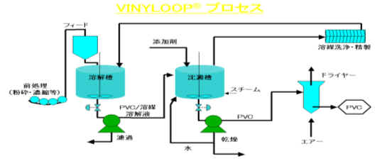溶剤中に溶解した塩ビ溶液からスチーム・ストリッピング操作により溶剤を蒸発させ、塩ビを粒状に固化沈殿させ回収する。再生品はバージン材と比べても物性が劣化しておらず、再利用が可能。 |
