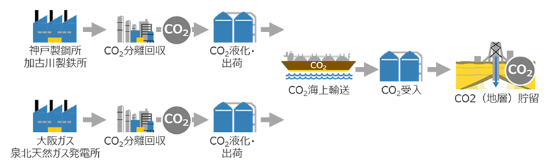 大阪ガスと神戸製鋼所は、シェルと2025年6月より神戸製鋼所の加古川製鉄所(兵庫県)を対象にした本調査を開始し、2026年3月まで、製鉄所の排出源からのCO2回収、回収したCO2の液化・貯蔵・出荷ならびに海外への船舶輸送(泉北天然ガス発電所から排出されたCO2との共同輸送の検討含む)、海外での恒久的な地層貯留を想定したCCSバリューチェーンについて、初期的な事業性評価を行いました。